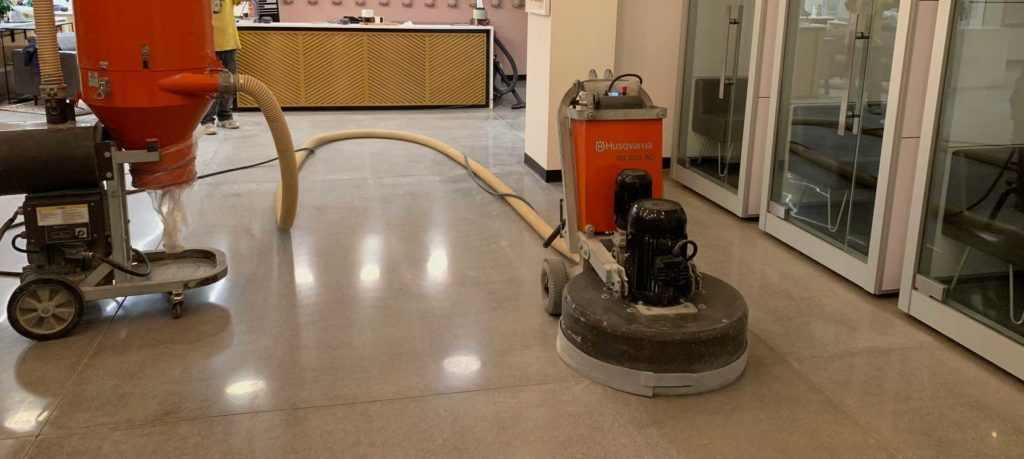 The concrete grinding process can be done to three different levels, ranging from a surface shave known as “concrete milk” to a deep grinding that exposes aggregates like marble, granite, or terrazzo chips. Polished concrete can then be densified or color-stained, resulting in durable, low-maintenance, and high-gloss installations.